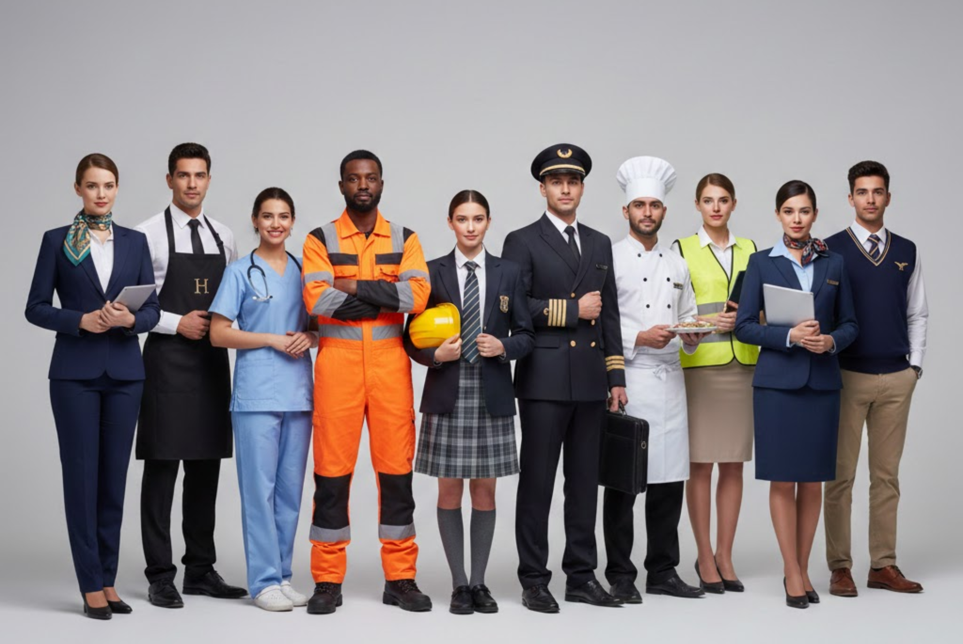 We provide uniforms for corporate, medical, hospitality, restaurant, industrial, security, school, and aviation sectors across Dubai, Sharjah, and the UAE.